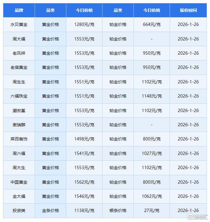 金饰价突破1580元/克! 北京时间1月26日上午,多家黄金珠宝品牌公布的境内足金饰品价格进一步上调,相较于1月5日公布的数据,...