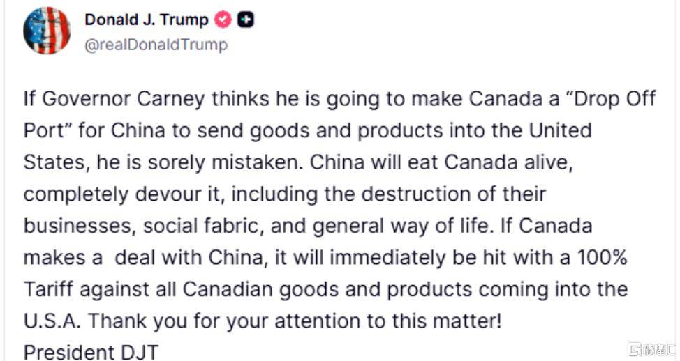 特朗普总统威胁称,如果加拿大执意与中国签署自由贸易协定,将对加拿大征收100%的关税。加拿大总理马克·卡尼立即予以反驳,称加拿大没有与中国签署自由贸易协定的计划。