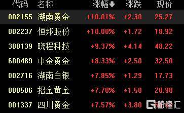 港、A股贵金属股集体走强。A股中,湖南黄金、恒邦股份涨停,晓程科技涨超9%,中金黄金、招金黄金涨超8%;港股中,中国白银集团涨超10%,中国黄金国际、赤峰黄金涨超6%。