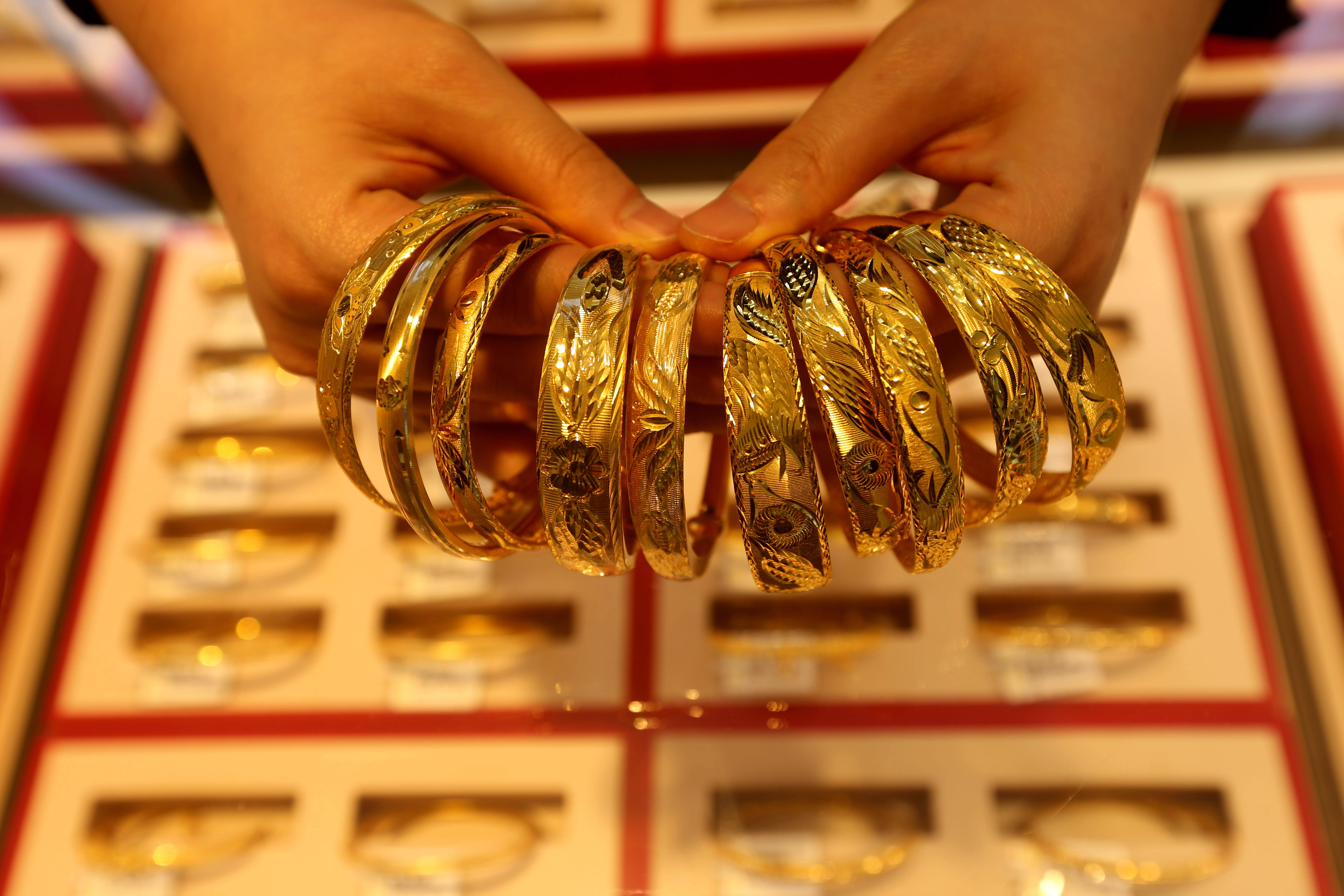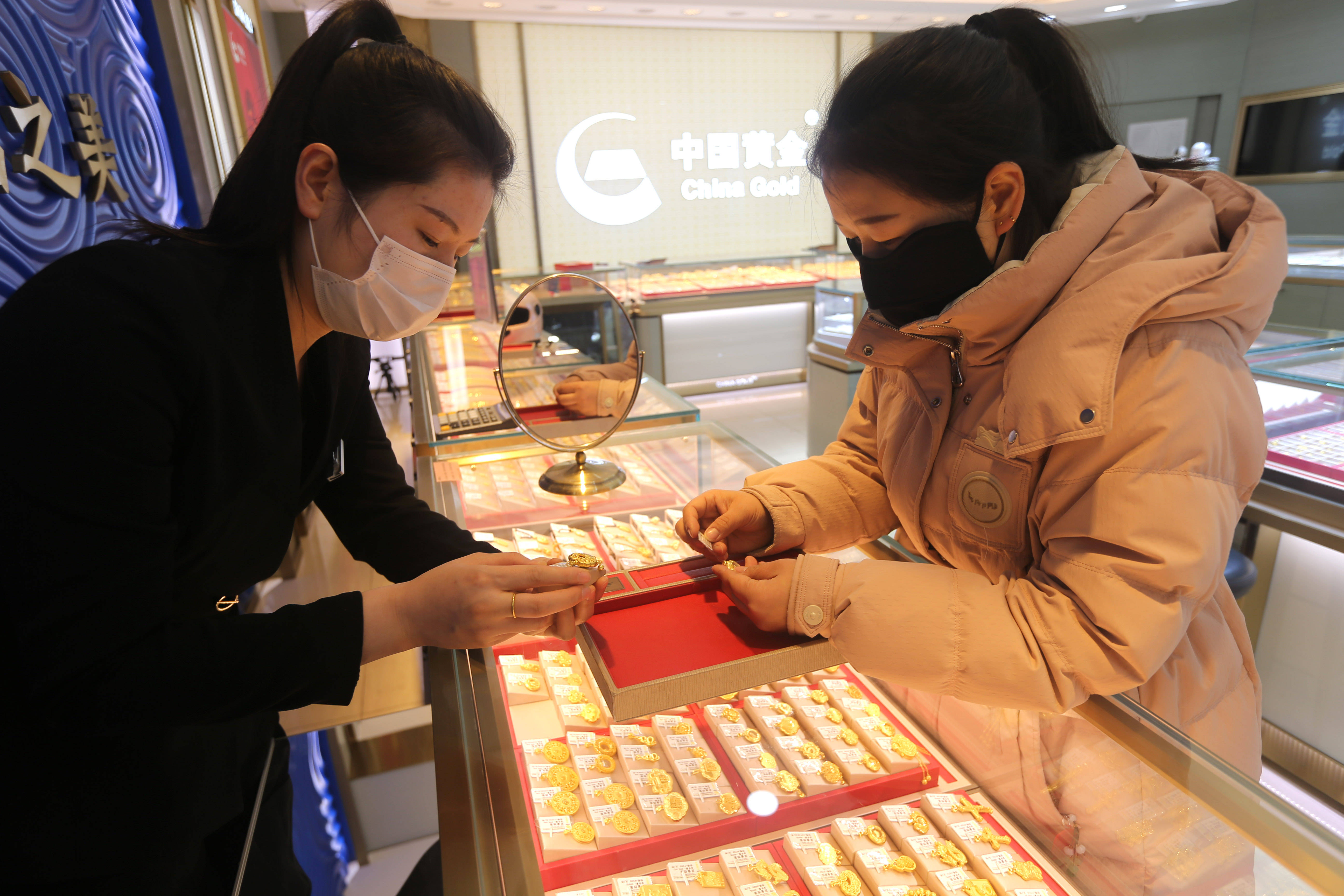 1月26日,市民在江苏省连云港市连云区一家黄金店挑选黄金饰品。 新华社发(王春 摄)