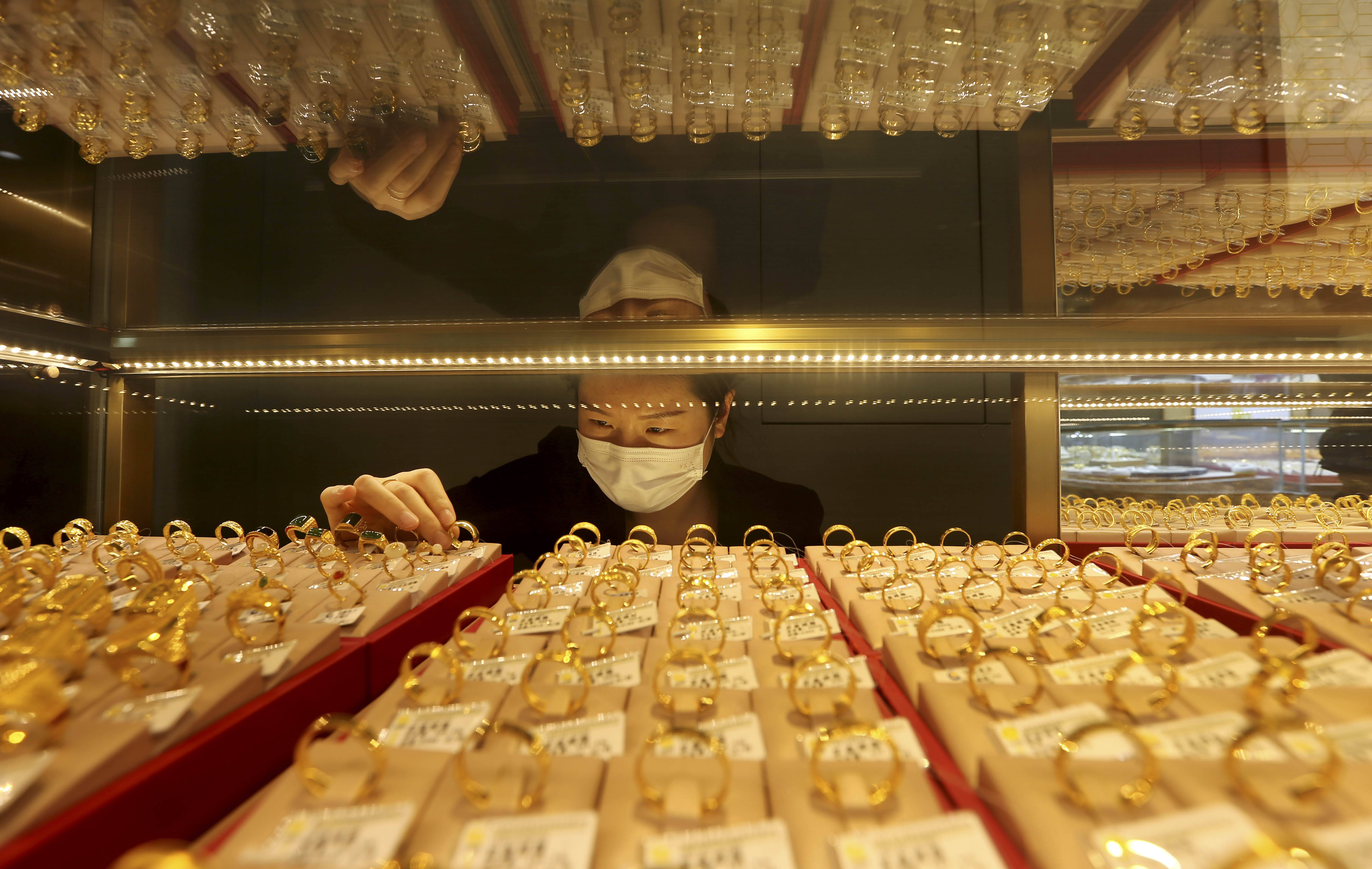 1月26日,江苏省连云港市连云区一家黄金店店员在整理黄金饰品。 新华社发(王春 摄)