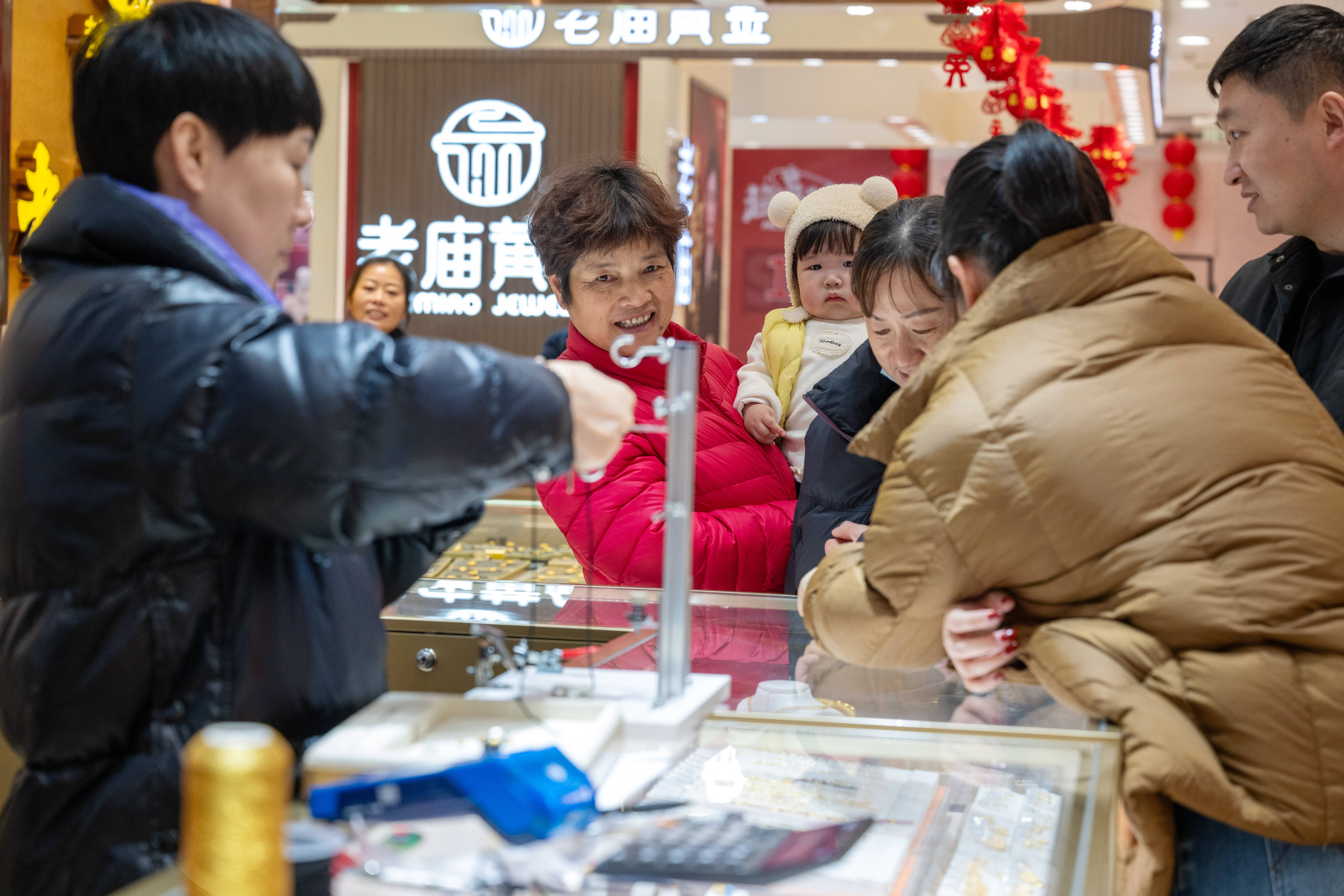 1月26日,市民在浙江省湖州市长兴县雉城街道一家商场选购黄金饰品。 新华社发(谭云俸 摄)