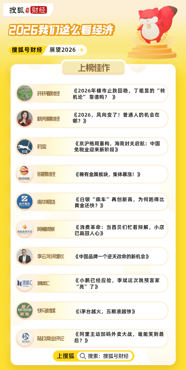 【2026我们这么看经济】活动现已完结,除了大V专家团、分析师与评论家对2026年的专业预测与分析,潜力新星@环环看财经、@晓芳聊财经、@豹变、@锐眼财经、@南华期货、@阿桶观察、@源媒汇、@快马财媒、@陆玖商业评论、@李云龙讲增长等挖掘了哪些资本市场与商业公司的风向标?