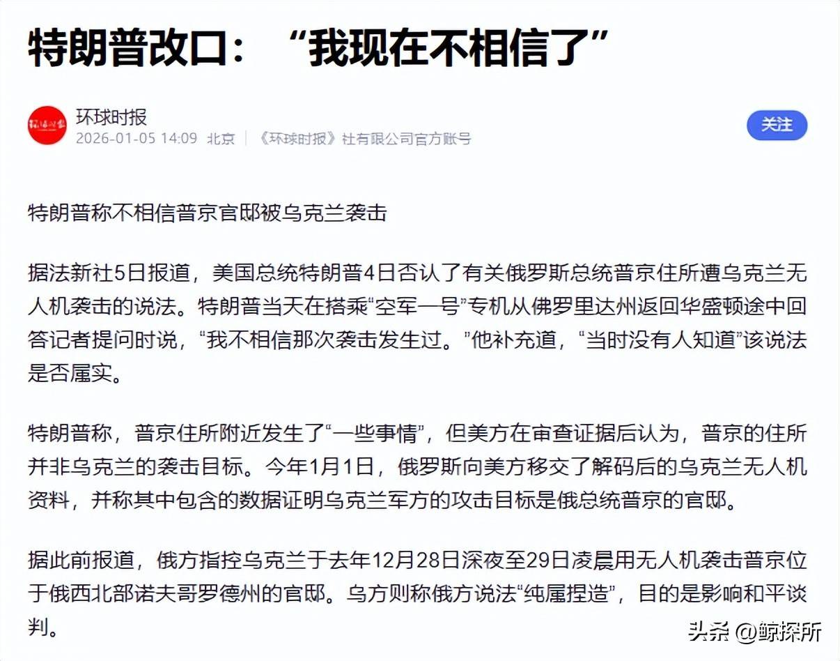要理解特朗普这一反转的背后动机,首先得理清时间线。2025年12月29日,特朗普在海湖庄园与以色列总理会面前,突然愤怒地对媒体表示,他早上与普京通了电话,普京告知他,乌克兰使用无人机袭击了他的官邸,这让他十分生气。他虽然承认情况不明,但明确表示普京总统说了这件事,如果真是乌克兰做的,那可真是大事。此时,他的态度明显站在普京一方,表示要追究乌克兰的责任。然而,才过了不到一周,到了2026年1月4日,特朗普在空军一号上接受记者采访时,却突然改变立场,否认袭击事件的存在。