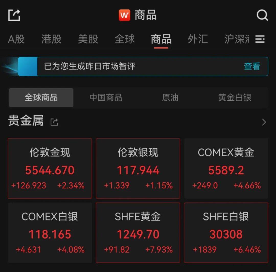 1月29日, 国际金价再次大幅上涨,现货、期货双双站上5500美元/盎司,其中,黄金期货一度突破 5600美元/盎司关口。截至13时30分,COMEX黄金报5589.2美元/盎司,上涨4.66%;伦敦金报5544.670美元/盎司,上涨2.34%。