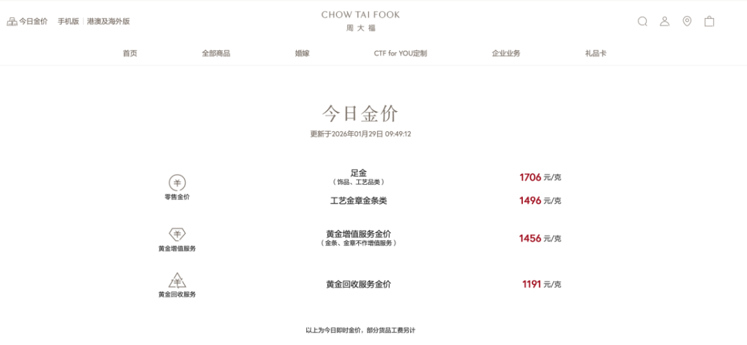 1月29日, 多家金饰品牌足金报价突破1700元/克。其中,周大福报 1706元/克,较昨日上涨88元/克;周生生报1708元/克,较昨日上涨94元/克;老庙黄金报1706元/克,较昨日上涨94元/克;老凤祥报1713元/克,较昨日上涨93元/克。