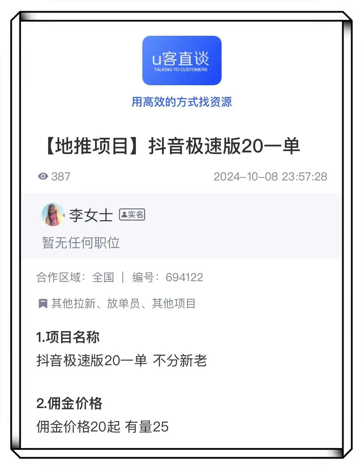通常而言,地推接单平台,如U客直谈、闲创无忧,都是很好的地推码获取渠道。