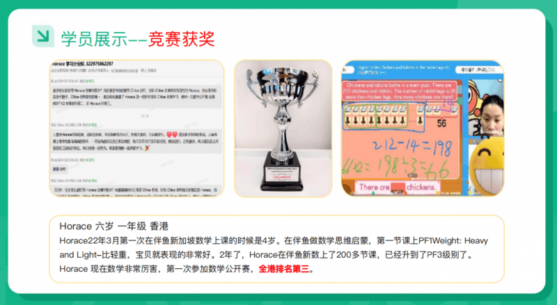 除了核心教学法,1 对 1 中英双语个性化教学更是提分加速器。师资录取合格率低于 2%,100% 持有教师资格证,平均教学经验 5 年以上,海归硕士、华杯赛优秀教练等精英师资,能精准匹配孩子学习节奏。学员可自主选择上课时间与老师,课后专属辅导小群实时跟进,老师根据错题定制变型题,结合跨学科场景拓展知识,让学习既有针对性又具趣味性。香港学员 Niki 在双语课堂中不仅数学提分,还能主动用英文交流,获学校老师表扬 “附加题轻松应对”。