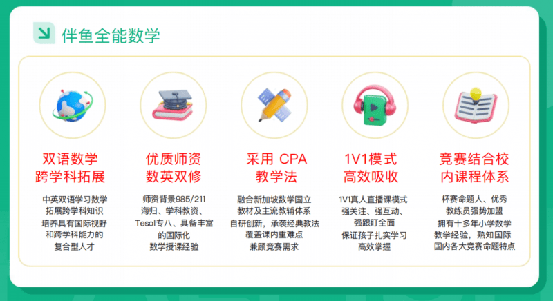 伴鱼全能数学摒弃死记硬背的传统教法,采用全球公认的新加坡 CPA 教学法 —— 从具象化实物操作切入,让孩子通过触摸、摆放理解数学概念;再过渡到形象化图形建模,将抽象问题可视化;最终抽象出数学公式与逻辑,让孩子真正 “懂原理、会应用”。