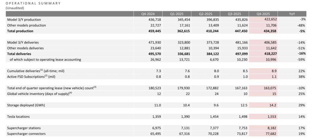 特斯拉2025年第四季度一共交付418,277辆车,较上年同期的495,570辆车减少16%;其中,Model 3/Y交付406,585辆车,较上年同期的471,930辆车减少14%;其他类型的车交付11,642辆车,较上年同期的23,640辆车减少51%。
