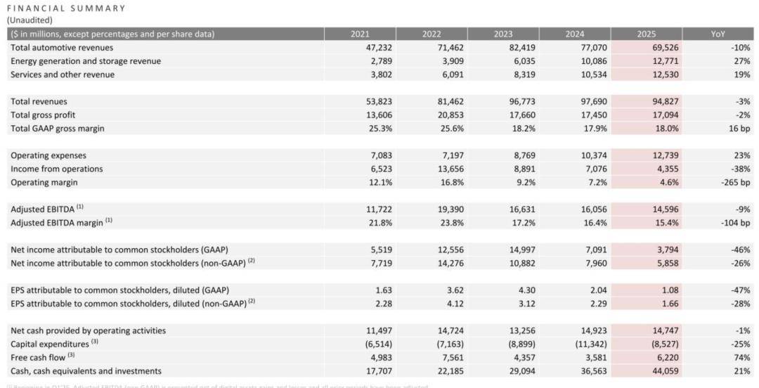 特斯拉(Tesla)日前发布截至2025年12月31日的财报。财报显示,特斯拉2025年营收为948.27亿美元,较上同期的976.9亿美元下降3%。