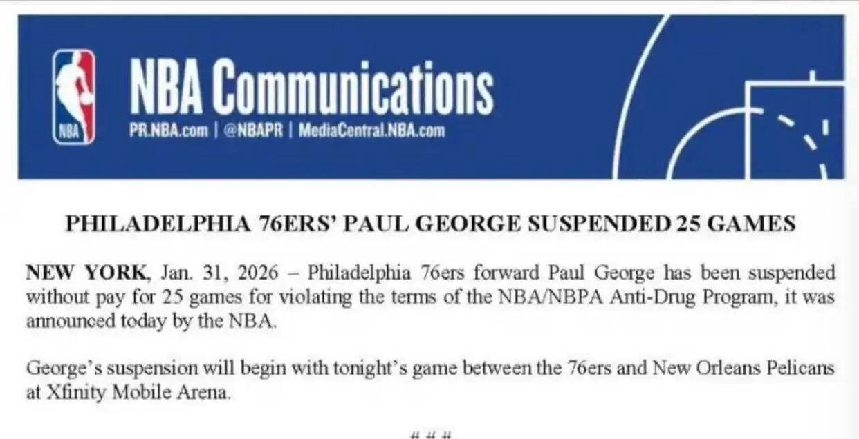 北京时间2026年2月1日,NBA联盟官方发布重磅公告,宣布费城76人全明星前锋保罗·乔治因违反禁药政策,被禁赛25场。这位休赛期以2.12亿美元巨额合同加盟76人的超级锋线,刚刚在对阵密尔沃基雄鹿的比赛中砍下35分,表现异常亮眼,然而转瞬之间,他便陷入低谷。本次禁赛将导致乔治至少损失1174万美元的薪水,而76人则将在奢侈税方面节省约587万美元。