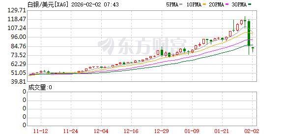 前一交易日,贵金属市场遭遇史诗级暴跌,Wind数据显示,截至上周五收盘,现货黄金暴跌9.25%,报4880.034美元/盎司,盘中一度暴跌12.92%,最低触及4682美元/盎司;现货白银价格盘中一度暴跌35.89%,最终收跌26.42%,报85.259美元/盎司;COMEX白银期货暴跌25.5%,报85.25美元/盎司,1月份累涨20.10%。