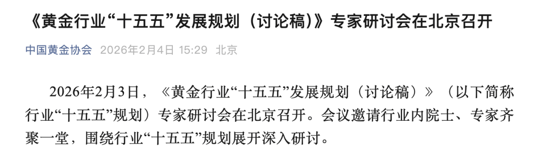 据中国黄金协会,2月3日,《黄金行业“十五五”发展规划(讨论稿)》(以下简称行业“十五五”规划)专家研讨会在北京召开。会议邀请行业内院士、专家齐聚一堂,围绕行业“十五五”规划展开深入研讨。