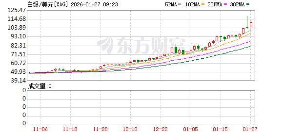 银价上周突破了100美元大关。本周一,白银在刷新历史高点后大幅回调。现货白银一度上涨14%,达117美元/盎司,随后跳水并抹去全部日内涨幅,收报约103.7美元/盎司。