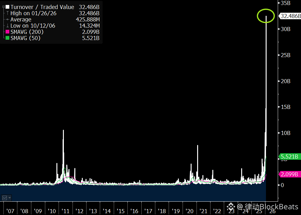 这种狂热在1月26日达到了顶峰——当天,白银ETF(SLV)的交易额达到了惊人的394亿美元,几乎逼近标普500指数ETF(SPY)的419亿美元。