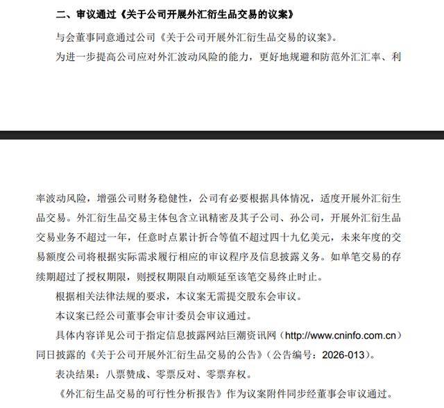 2月5日,立讯精密(002475.SZ)公告称,为进一步提高公司应对外汇波动风险的能力,更好地规避和防范外汇汇率、利率波动风险,增强公司财务稳健性,公司有必要根据具体情况,适度开展外汇衍生品交易。外汇衍生品交易主体包含立讯精密及其子公司、孙公司,开展外汇衍生品交易业务不超过一年,任意时点累计折合等值不超过四十九亿美元,未来年度的交易额度公司将根据实际需求履行相应的审议程序及信息披露义务。如单笔交易的存续期超过了授权期限,则授权期限自动顺延至该笔交易终止时止。