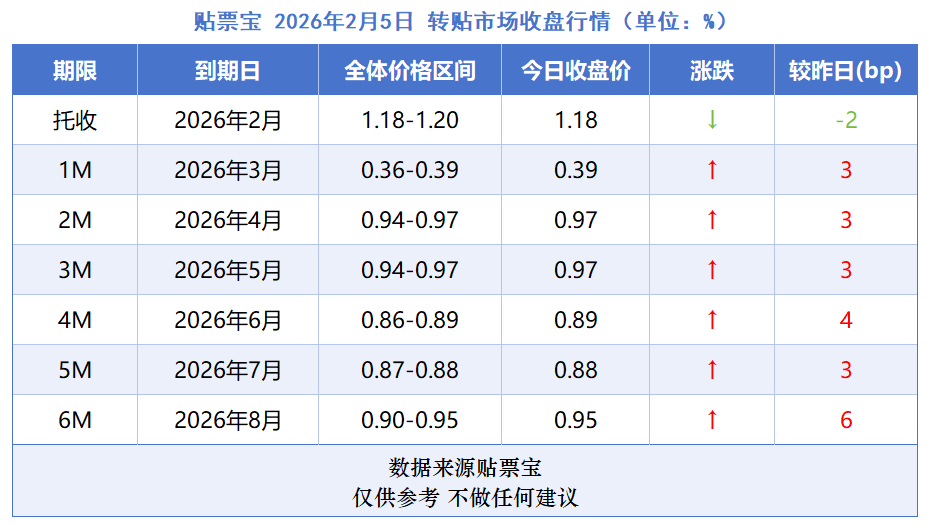 2月5日转贴市场延续前日回暖态势,呈现普涨格局,买盘情绪在低价区域继续释放。托收品种价格小幅下行2bp至1.18%,是本日唯一下跌品种。其他各期限品种则全线温和上涨,涨幅在3-6bp之间,且多数品种(1M、2M、3M、6M)收盘价均收于当日价格区间上限,显示买盘报价积极,推动价格稳步上行。其中,6M品种上涨6bp,涨幅居首;4M品种上涨4bp,亦表现活跃。整体市场呈现“普涨上行、买盘占优”的特征,在经历短期剧烈调整后,市场做多力量逐步凝聚,各期限价格在新的利率平台得到支撑。