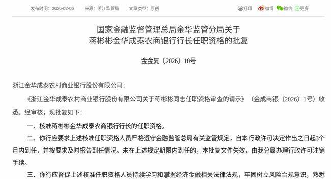 2026年2月6日,根据国家金融监督管理总局消息,《浙江金华成泰农村商业银行股份有限公司关于蒋彬彬同志任职资格审查的请示》获得通过,批复蒋彬彬浙江金华成泰农村商业银行股份有限公司行长的任职资格。
