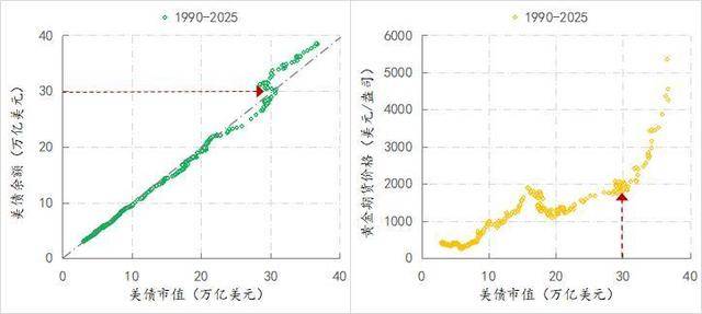 当2022年美债余额突破30万亿美元之后,美债的总市值开始趋势性低于美债余额,数据点从对角线下方移动至对角线上方,对于美债持有者而言,其手中美债的价值是缩水的,而与美债余额突破30万亿美元同步,黄金价格在突破2000美元/盎司后,进去趋势性上涨,而且上涨的斜率越来越陡,见下右图。