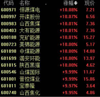 具体来看,煤炭概念掀涨停潮,陕西黑猫、兖矿能源、中煤能源等10余股涨停。