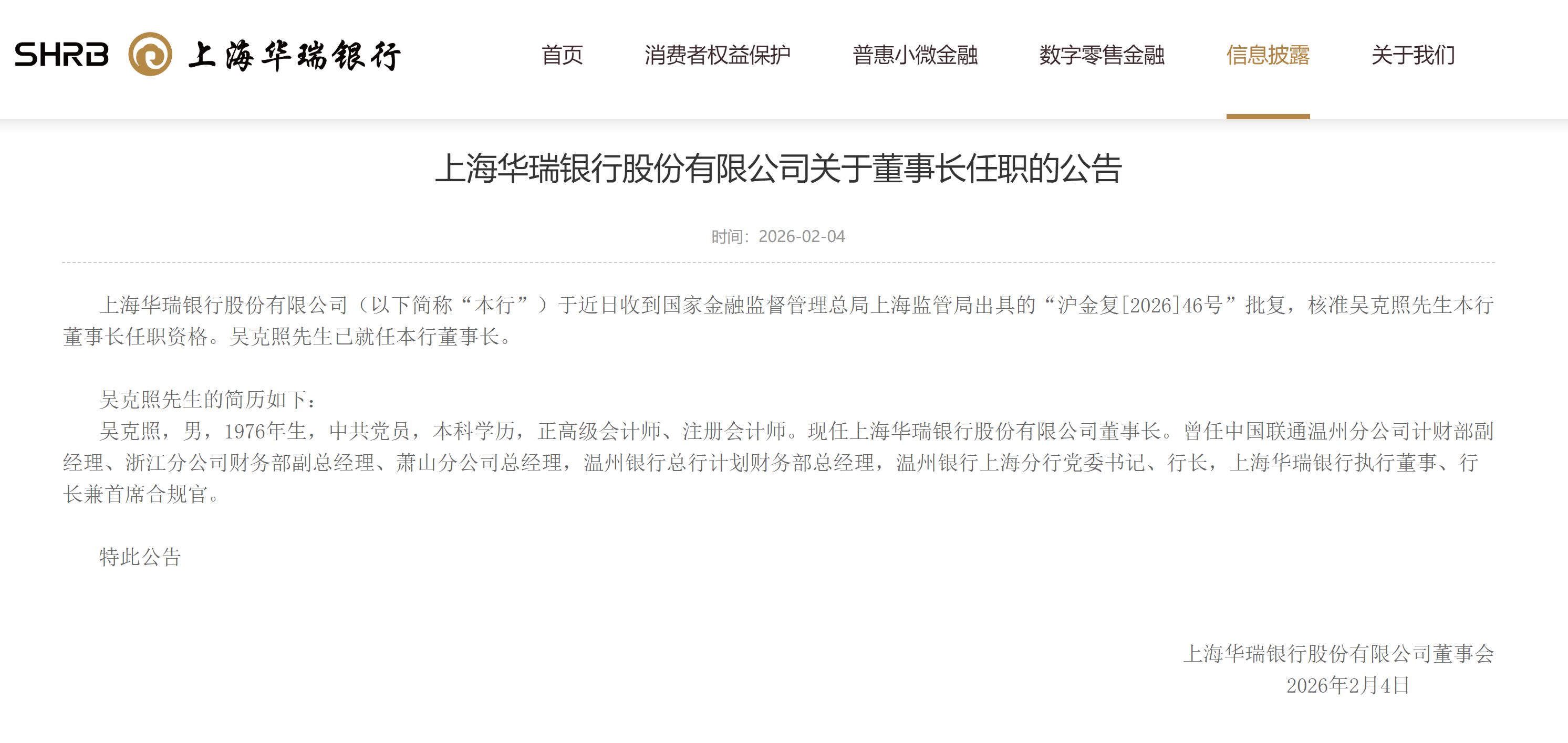 上海华瑞银行原董事长为曹彤,其董事、董事长的任职资格于2022年7月获监管核准。2025年3月,曹彤因个人原因辞去华瑞银行董事、董事长职务。