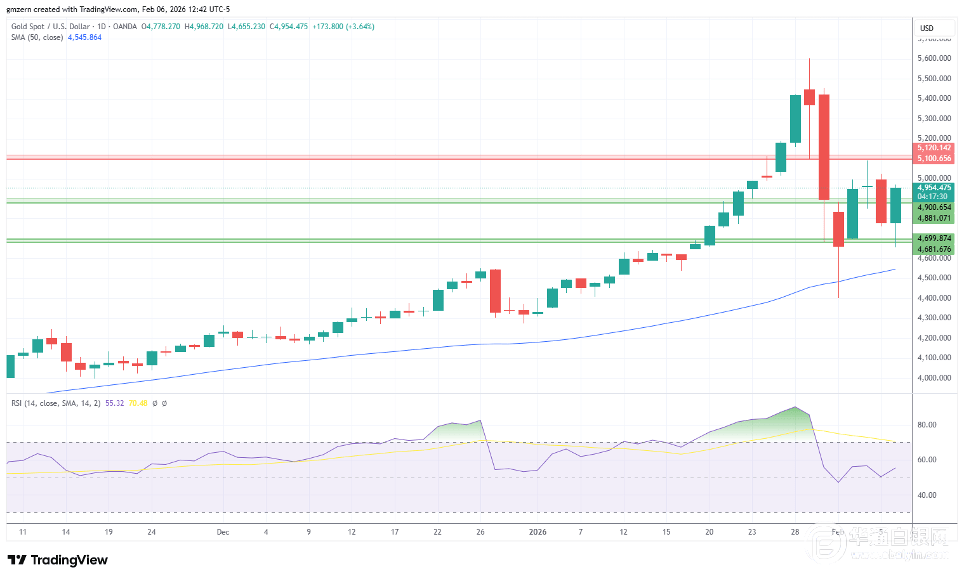 若金价突破5000美元这一关口,则将有望触及5100至5120美元阻力位。