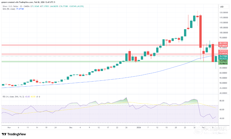 白银触及新低,但失去上涨动力,随后反弹至78.00-79.00美元阻力位。