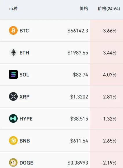 3月27日晚,比特币一度跳水跌破66000美元,截至28日7:36,比特币跌超3.6%,以太坊跌至1987美元跌超3%,SOL跌超4%,XRP、狗狗币等均下跌。